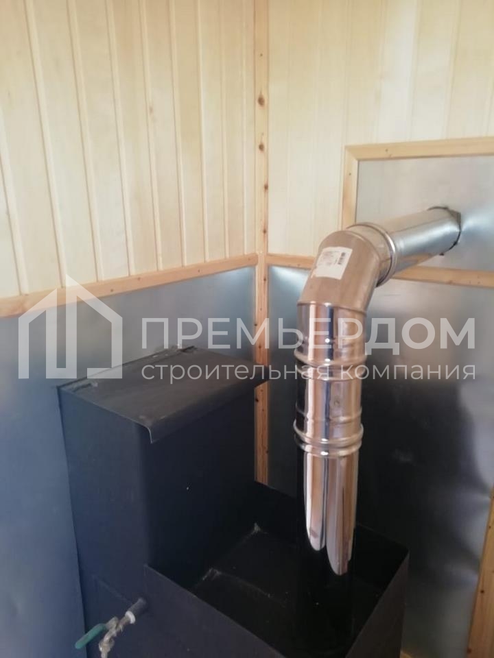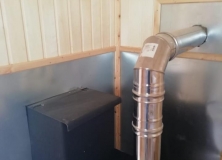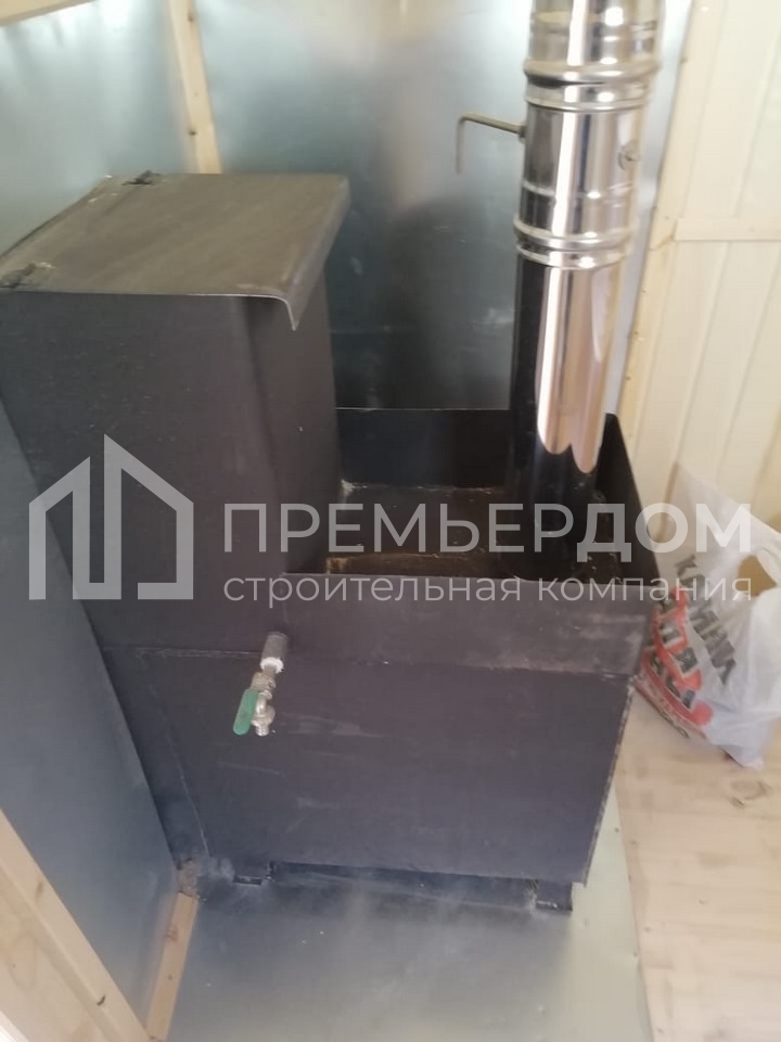 Сварная с баком для воды на 45 литров. Вывод дымохода через стену. |
